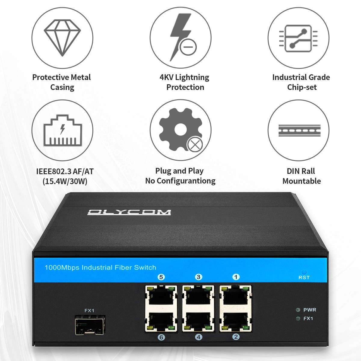 สวิตช์อีเธอร์เน็ต POE din 6 พอร์ตแบบไม่มีการจัดการนี้ยังมีคุณสมบัติดังต่อไปนี้